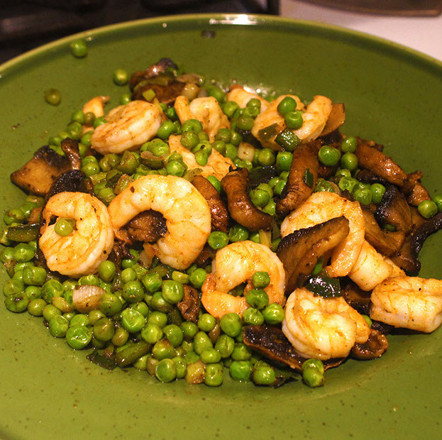 Evil Auntie's Pan Fried Shrimp with English peas & Portobello mushrooms